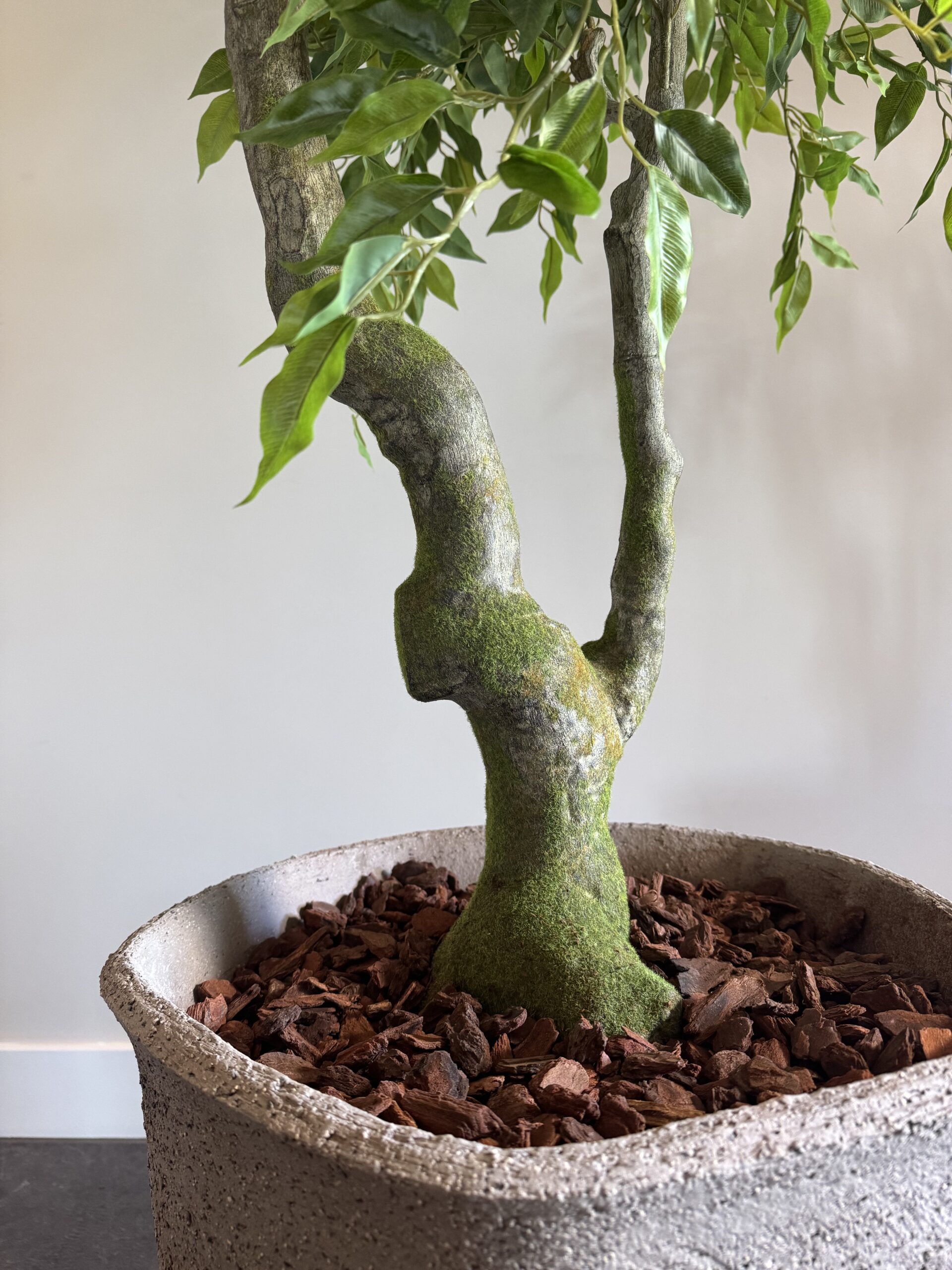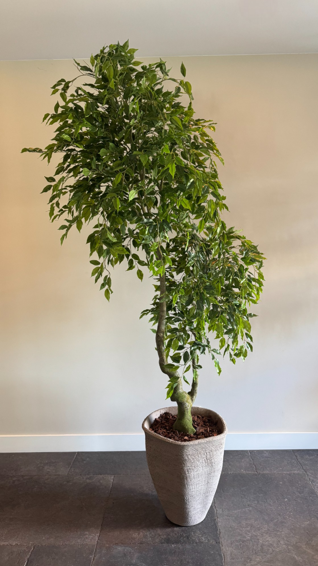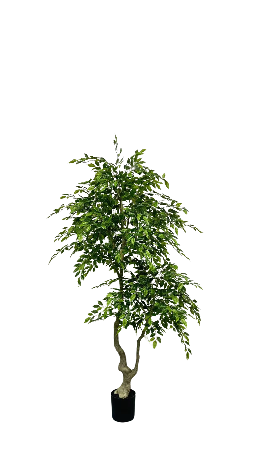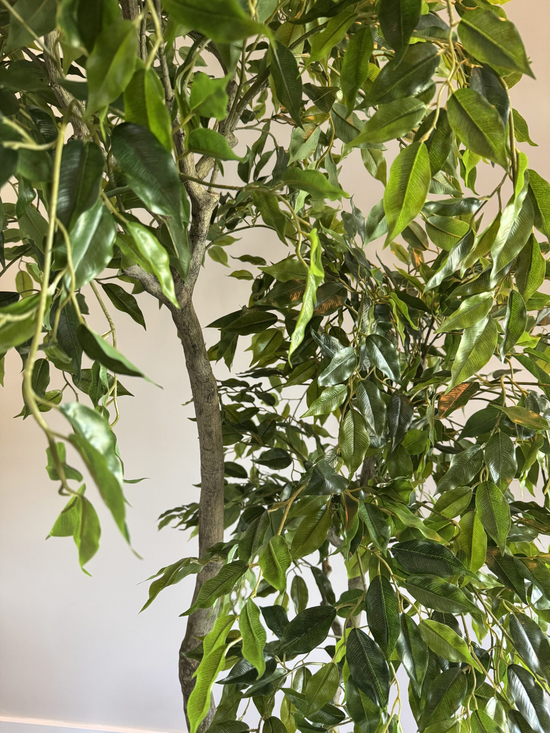 De zijden Ficus Benjamina van 210 cm is een elegante kunstboom met een volle bladstructuur en verfijnde uitstraling. De smalle, glanzende blaadjes en de sierlijk vertakte stam geven deze klassieker een levensecht en tijdloos karakter. Perfect voor het toevoegen van rust, hoogte en groen aan grote ruimtes.